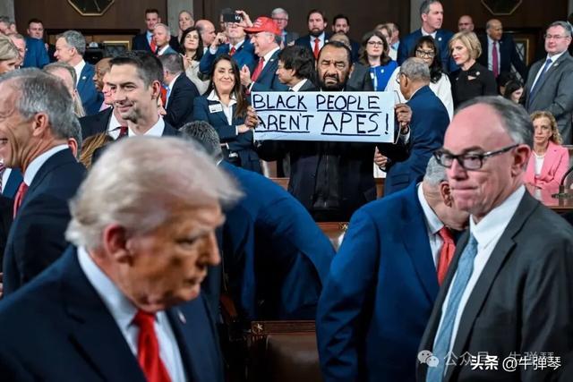 演讲刚开始,民主党众议员阿尔·格林就举起“黑人不是猿猴”的标语,讽刺特朗普将奥巴马夫妇P成了猿猴,涉嫌严重的种族歧视。